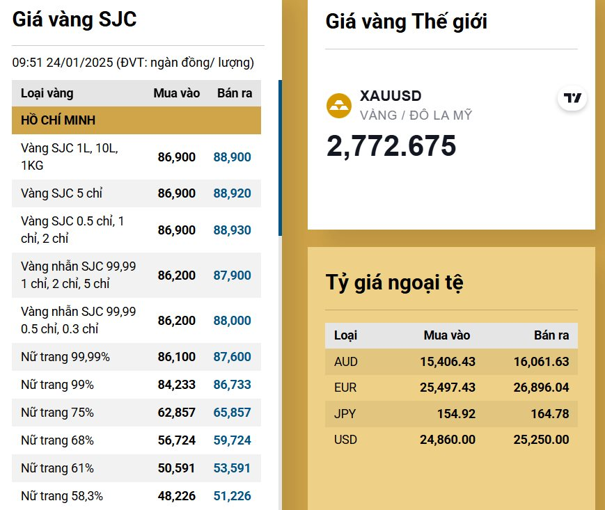 Khảo sát giá vàng lúc 10h55 sáng ngày 24/1, Công ty TNHH MTV Vàng bạc đá quý Sài Gòn (SJC) neo giá vàng miếng ở mức 86,9 - 88,9 triệu đồng/lượng (mua - bán), tăng 800.000 đồng ở chiều mua và chiều bán so với giá niêm yết lúc 16h41 ngày 23/1. Chênh lệch giữa 2 chiều mua - bán là 2 triệu đồng.