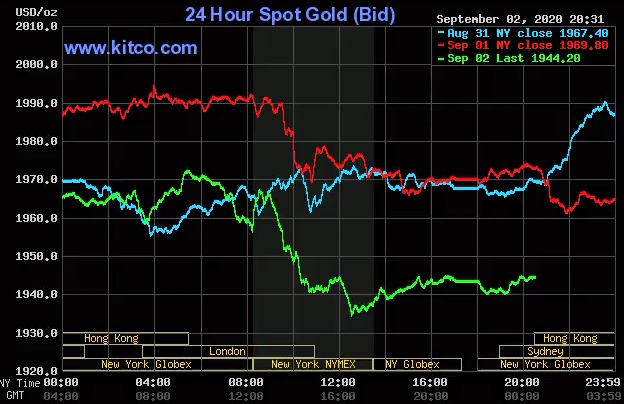 Chốt phiên 2/9, giá vàng thế giới giao ngay giảm 26,7 USD về 1.943 USD một ounce. Trong phiên, giá có thời điểm về 1.935 USD. Sáng nay, giá vẫn dao động quanh mốc này.