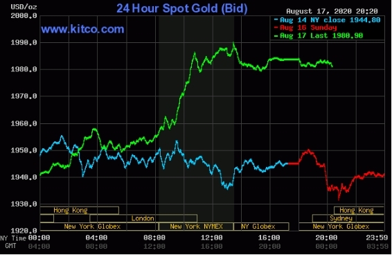Chốt phiên 17/8, mỗi ounce vàng giao ngay thế giới tăng 38,8 USD lên 1.983 USD một ounce. Trong phiên, giá có thời điểm lên 1.991 USD. Đến sáng nay, giá hiện dao động quanh 1.980 USD.