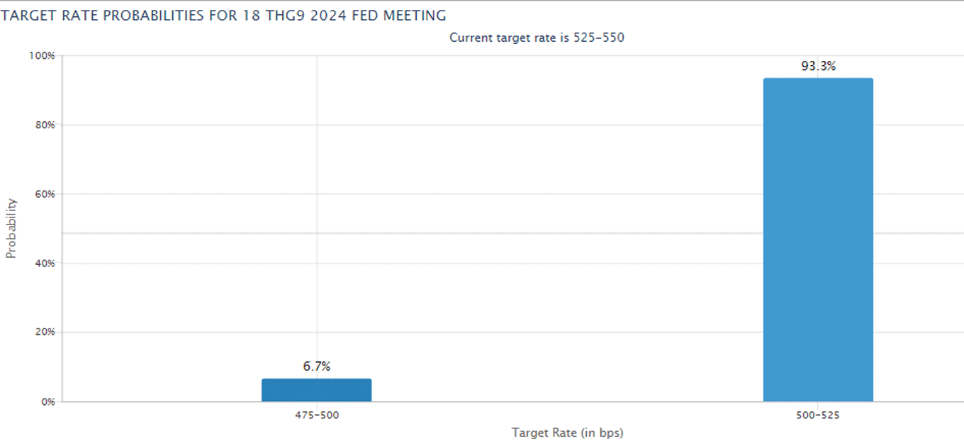Tính tới 22h40 ngày 16/7 (giờ Việt Nam), theo các tín hiệu từ công cụ CME FedWatch, thị trường hiện đánh cược 100% khả năng Fed sẽ cắt giảm lãi suất vào ngày 18/9. Trong đó có 93,3% khả năng Fed sẽ cắt giảm lãi suất 25 điểm phần trăm, từ mức 5,25-5,5%/năm hiện tại xuống 5-5,25%/năm. Còn lại, 6,7% khả năng Fed cắt giảm 50 điểm. Hôm 3/7, tỷ lệ cắt giảm lãi suất thấp chỉ ở mức 67%.