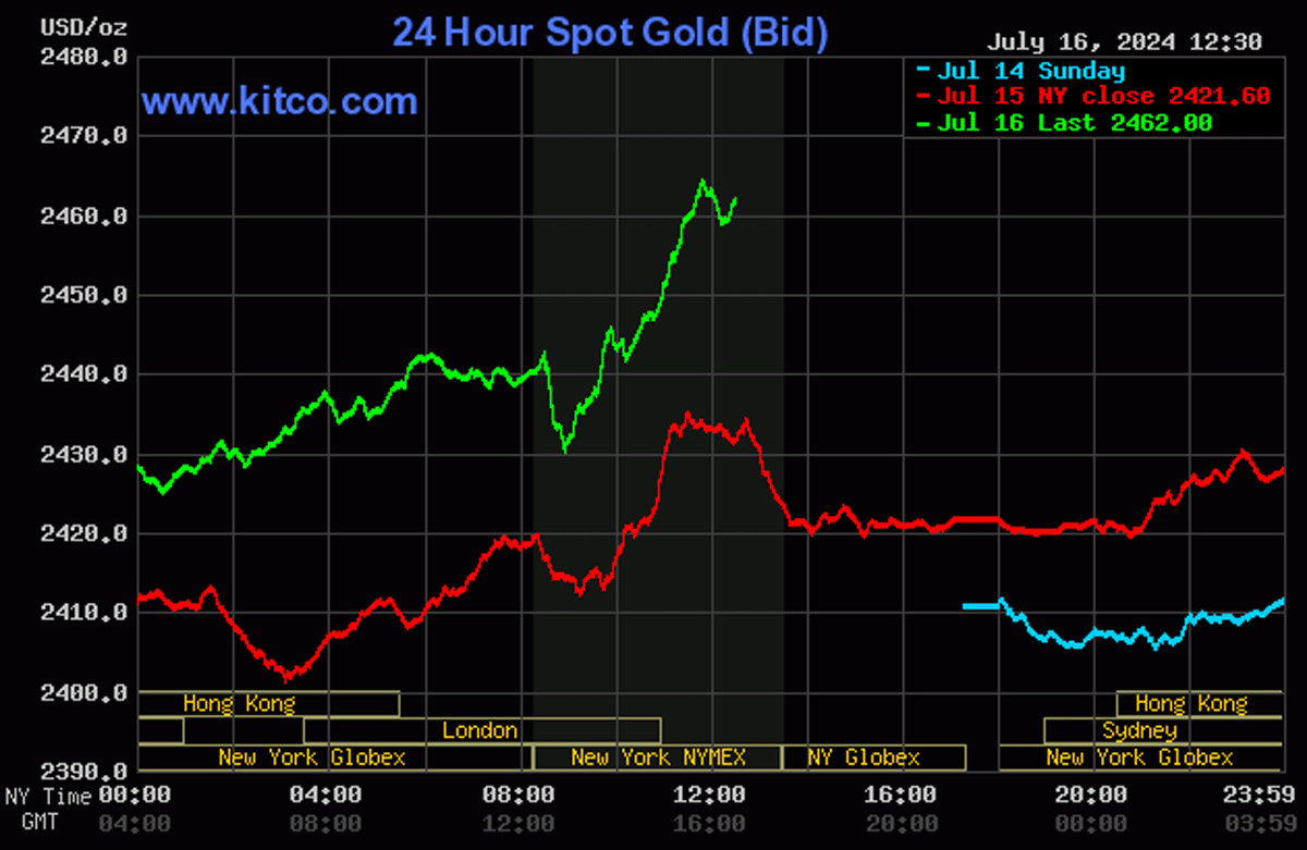 Trong phiên giao dịch 16/7 trên thị trường New York (đêm 16/7 giờ Việt Nam), tính đến 22h30 giá vàng giao ngay bất ngờ tăng thêm 40 USD, lên trên ngưỡng 2.460 USD/ounce (76,2 triệu đồng/lượng). Đây là kỷ lục mới, cao hơn đỉnh lịch sử 2.450 USD/ounce ghi nhận hôm 20/5.
