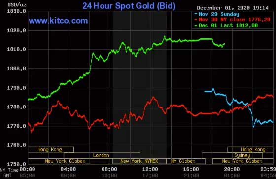 Chốt phiên giao dịch 1/12, giá vàng giao ngay thế giới tăng 39 USD lên 1.815 USD một ounce. Sang phiên sáng nay, kim loại quý hiện giao dịch tại 1.812 USD. Chỉ mới phiên trước đó, vàng còn xuống đáy 5 tháng tại 1.765 USD một ounce, do nhà đầu tư đổ dồn sang tài sản rủi ro.