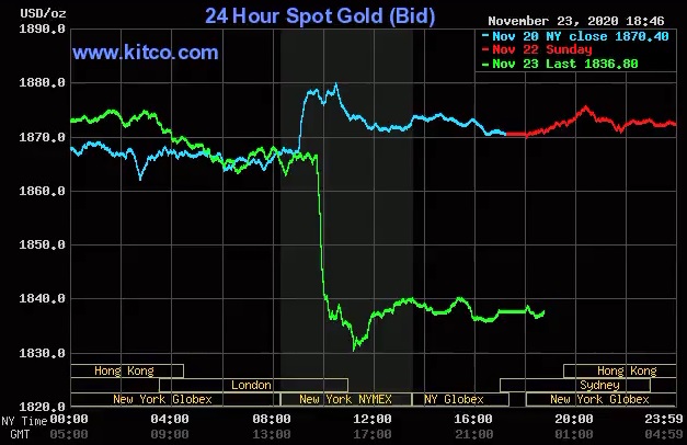 Chốt phiên giao dịch 23/11, giá vàng giao ngay thế giới giảm 33 USD về 1.837 USD một ounce. Trong phiên, giá có thời điểm về 1.830 USD – thấp nhất kể từ ngày 21/7.