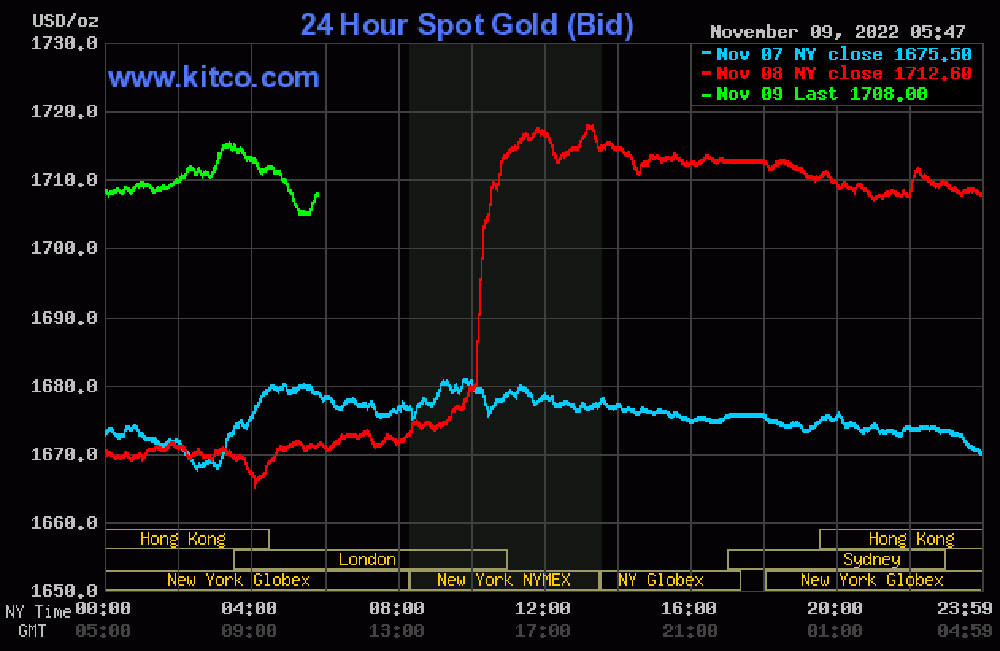 Trên thị trường thế giới, giá vàng hôm nay (9/11) tăng vọt lên mức cao nhất 4 tuần do đồng USD mất giá và thị trường tiền điện tử bị bán tháo. Vào lúc 17h31' ngày 9/11 (giờ Việt Nam), giá vàng giao ngay ở mốc 1.704,8 USD/ounce.