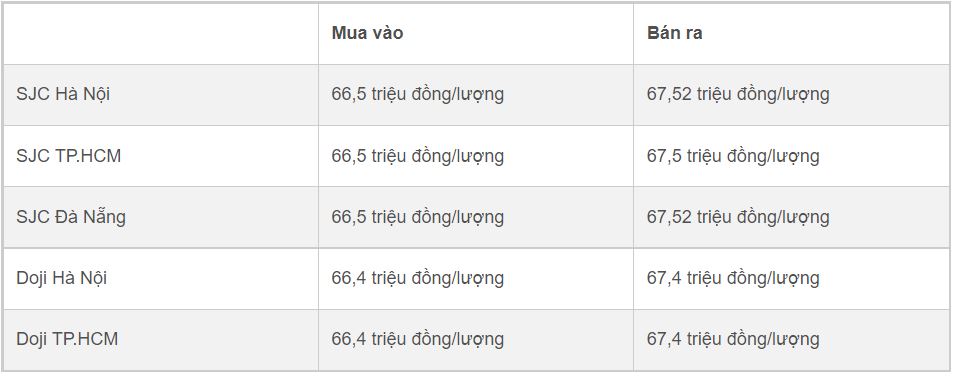 Mua vào Bán ra SJC Hà Nội 66,5 triệu đồng/lượng 67,52 triệu đồng/lượng SJC TP.HCM 66,5 triệu đồng/lượng 67,5 triệu đồng/lượng SJC Đà Nẵng 66,5 triệu đồng/lượng 67,52 triệu đồng/lượng Doji Hà Nội 66,4 triệu đồng/lượng 67,4 triệu đồng/lượng Doji TP.HCM 66,4 triệu đồng/lượng 67,4 triệu đồng/lượng