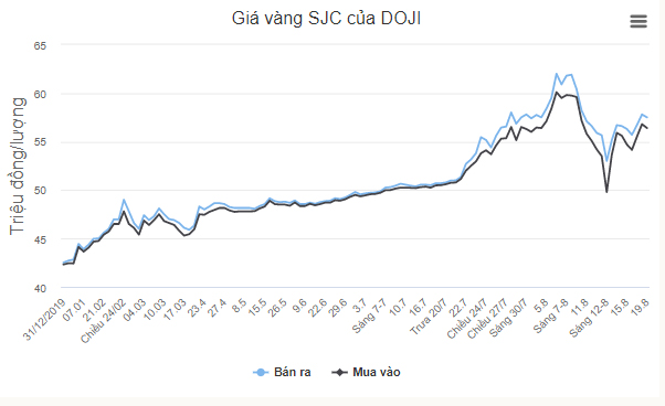Sáng nay (19/8), Tập đoàn Vàng bạc đá quý DOJI giảm giá mua bán khoảng 300.000 đồng so với hôm qua xuống 56,4 -57,5 triệu đồng một lượng.