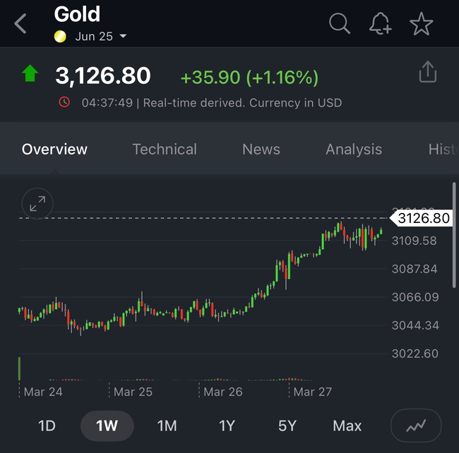 Trong khi đó, giá vang tương lai nhảy vọt lên tới 3.126 USD/Ounce.