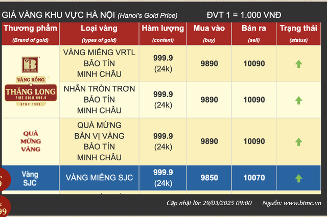 29/03/2025 17:24Giá vàng trong nước lên gần 101 triệu đồng/lượng
