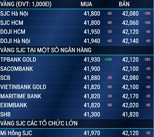 Cụ thể: Giá vàng SJC tại Hà Nội giao dịch ở mức mua vào là 41,80 triệu đồng/lượng (giảm 80.000 đồng/lượng so với phiên giao dịch hôm trước) và bán ra ở ngưỡng 42,08 triệu đồng/lượng (giảm 100.000 đồng/lượng so với cuối phiên giao dịch hôm trước).