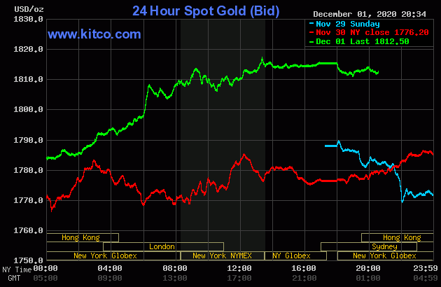 Trên thế giới, giá vàng phục hồi mạnh mẽ và vượt mốc 1.800 USD/ounce trong đêm 1/12 giờ Việt Nam. Đến 8h10 (2/12 giờ Việt Nam), giá vàng giao ngay đã tăng lên mức 1.812,6 USD/ounce, tương đương 50,8 triệu đồng/lượng.