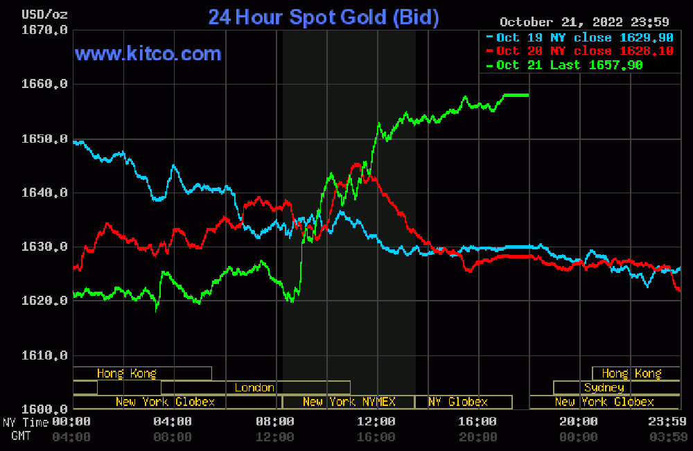 Trên thị trường thế giới, giá vàng hôm nay tăng mạnh, tới hơn 30 USD, lên ngưỡng tâm lý quan trọng 1.650 USD/ounce. Vào lúc 17h22' hôm nay (22/10, giờ Việt Nam), giá vàng giao ngay ở mốc 1.657,9 USD/ounce.