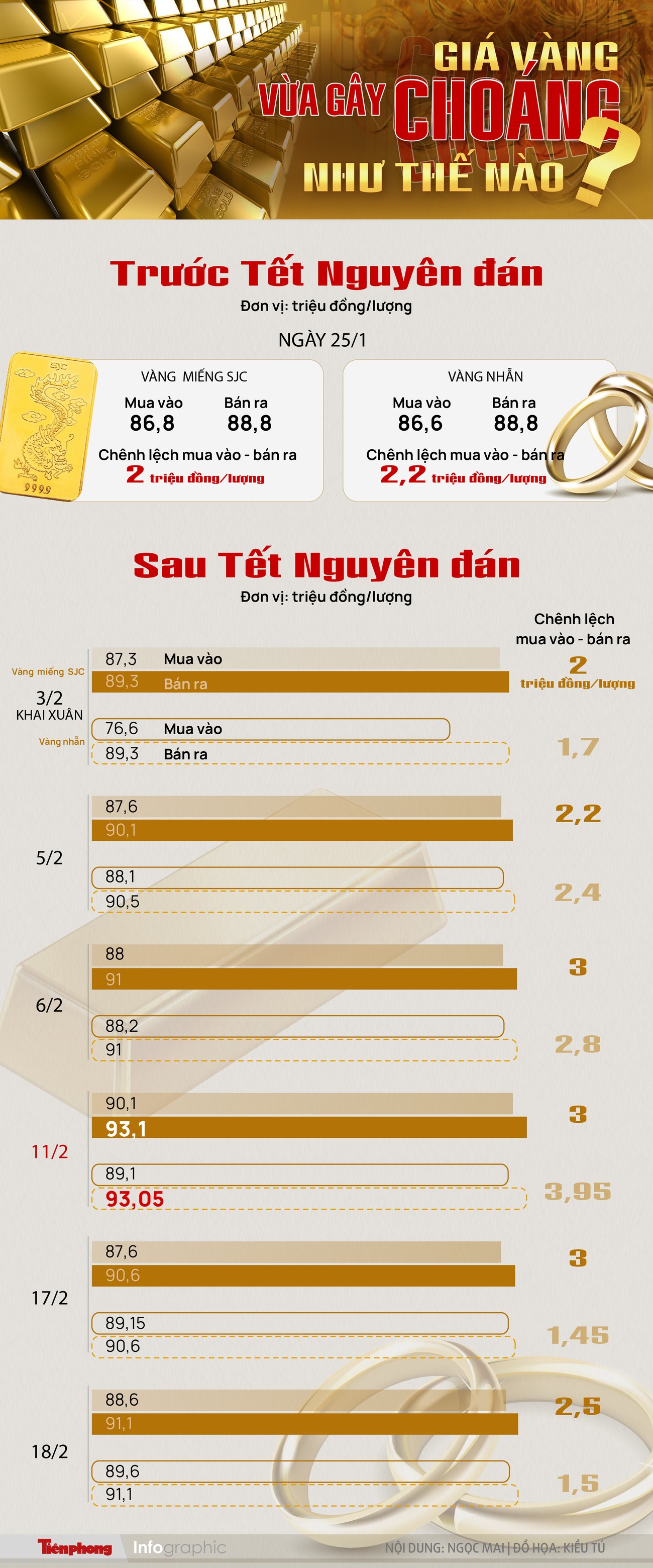 Giá vàng trong nước tăng mạnh sau Tết Nguyên đán, có thời điểm vọt lên cao nhất mọi thời đại với mức bán ra 93,5 triệu đồng/lượng vàng nhẫn và 93,1 triệu đồng/lượng với SJC; chênh lệch mua vào - bán ra lớn khiến người mua gặp nhiều rủi ro.