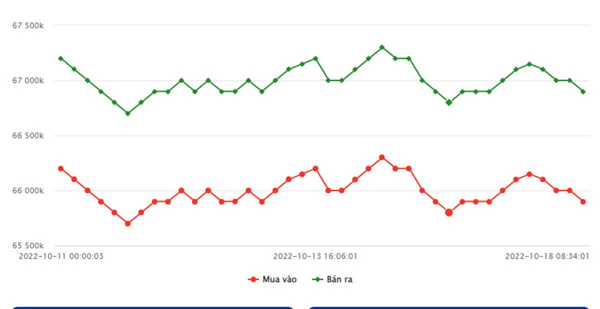 Cụ thể, mở cửa thị trường hôm nay (ngày 18/10), giá vàng miếng của SJC niêm yết tại thị trường Hà Nội ở mốc 65,9 triệu đồng/lượng (mua vào) và 66,92 triệu đồng/lượng (bán ra), giảm 100 nghìn đồng/lượng ở cả chiều mua vào và chiều bán ra so với kết thúc phiên giao hôm qua, mất mốc 67 triệu đồng/lượng.