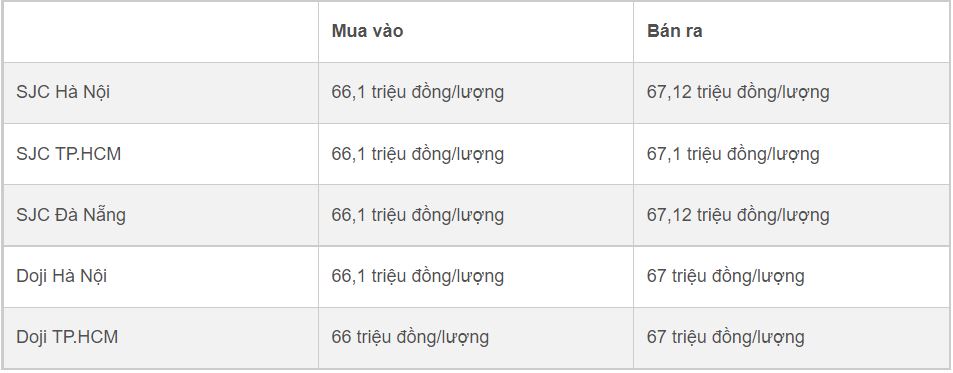 Còn giá vàng miếng của Tập đoàn Vàng bạc đá quý Doji tại Hà Nội vào đầu giờ sáng nay được giao dịch ở mức giá 65,9 triệu đồng/lượng (mua vào) và 66,8 triệu đồng/lượng (bán ra), giảm 100 nghìn đồng/lượng ở cả hai chiều so với chốt phiên giao dịch hôm qua.
