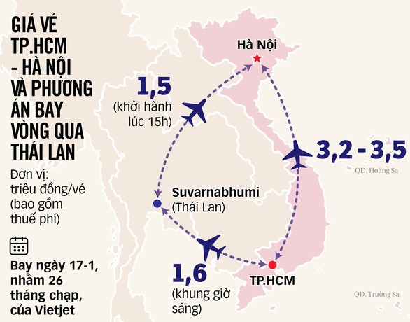 Giá vé khảo sát ngày 17-1 (nhằm 26 tháng chạp) chặng TP.HCM - Suvarnabhumi (Thái Lan) của Vietjet là 1,6 triệu đồng/vé với khung giờ sáng. Nếu bay chuyến này rồi đáp chặng bay nối chuyến về đến Hà Nội (khởi hành vào 15h) giá là 1,5 triệu đồng/vé. Như vậy, tổng cộng giá vé cho TP.HCM - Bangkok - Hà Nội là 3,1 triệu đồng (bao gồm thuế, phí). Trong khi đó, cùng ngày, chặng bay thẳng TP.HCM - Hà Nội giá vé 3,2 - 3,5 triệu đồng/vé (bao gồm thuế phí) với hàng chục chuyến bay mỗi ngày.