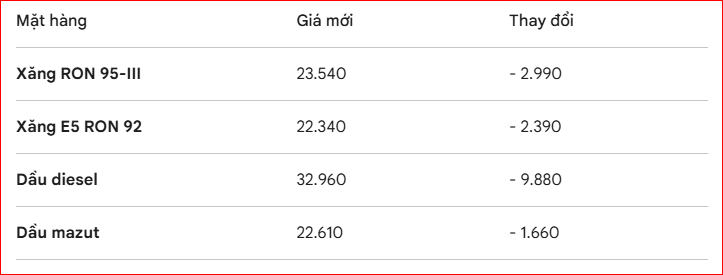 Theo quyết định của Liên bộ Công Thương - Tài chính, từ giữa chiều nay, thị trường năng lượng trong nước ghi nhận đợt điều chỉnh giảm giá mạnh trên tất cả các mặt hàng. Cụ thể, giá xăng RON 95-III (loại phổ biến trên thị trường) giảm 2.990 đồng, về mức 23.540 đồng/lít. Xăng E5 RON 92 cũng hạ 2.390 đồng, có giá mới là 22.340 đồng/lít.