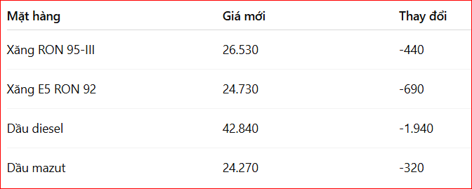 Các mặt hàng dầu giảm 320-1.940 đồng mỗi lít, kg so với kỳ điều hành trước. Trong đó, dầu diesel giảm mạnh nhất 1.940 đồng xuống 42.840 đồng một lít, dầu mazut giảm 320 đồng còn 24.270 đồng một kg.
