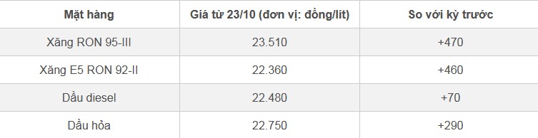 Trong khi đó, giá dầu diesel tăng lên 22.480 đồng/lít, còn giá bán lẻ dầu hỏa lên mức 22.750 đồng/lít.