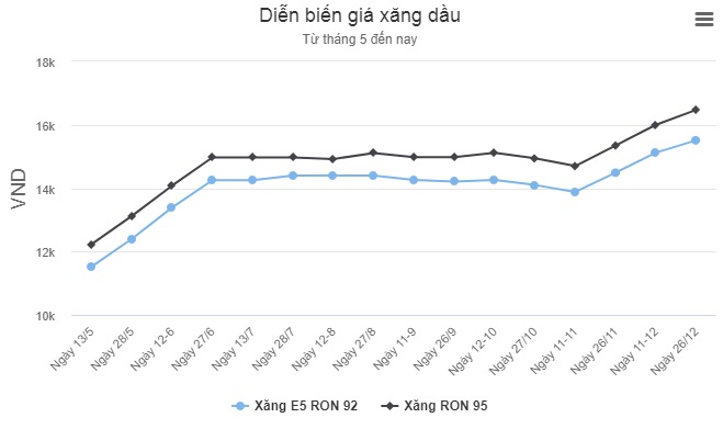 Liên Bộ Công Thương - Tài chính cho biết, với việc điều chỉnh này, giá xăng E5 RON 92 lên tối đa 15.518 đồng mỗi lít. RON 95 giá cao nhất 16.479 đồng mỗi lít. Dầu diesel là 12.376 tăng 484 đồng một lít. Dầu hoả là 11.188 tăng 411 đồng mỗi lít, Dầu madut tối đa 12.272, tăng 330 đồng.
