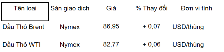 Giá dầu Brent được giao dịch ở mức 86,95 USD/thùng, tăng 0,06 USD, tương đương 0,07% so với phiên liền trước. Còn giá dầu WTI ở mức 82,77 USD/thùng, tăng 0,05 USD, tương đương 0,06% so với phiên liền trước.
