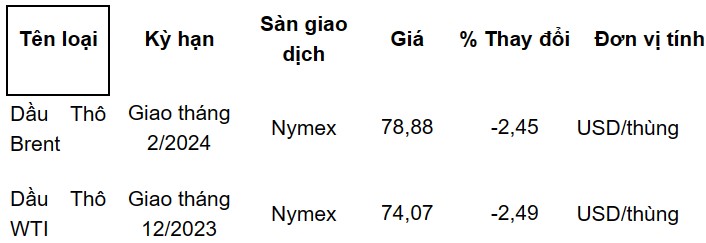 Giá dầu Brent kỳ hạn giao tháng 2 giảm 1,98 USD, tương đương 2,45%, xuống 78,88 USD/thùng; trong khi đó, dầu thô WTI của Mỹ lùi 1,89 USD, tương đương 2,49% và đóng cửa ở mức 74,07 USD/thùng.
