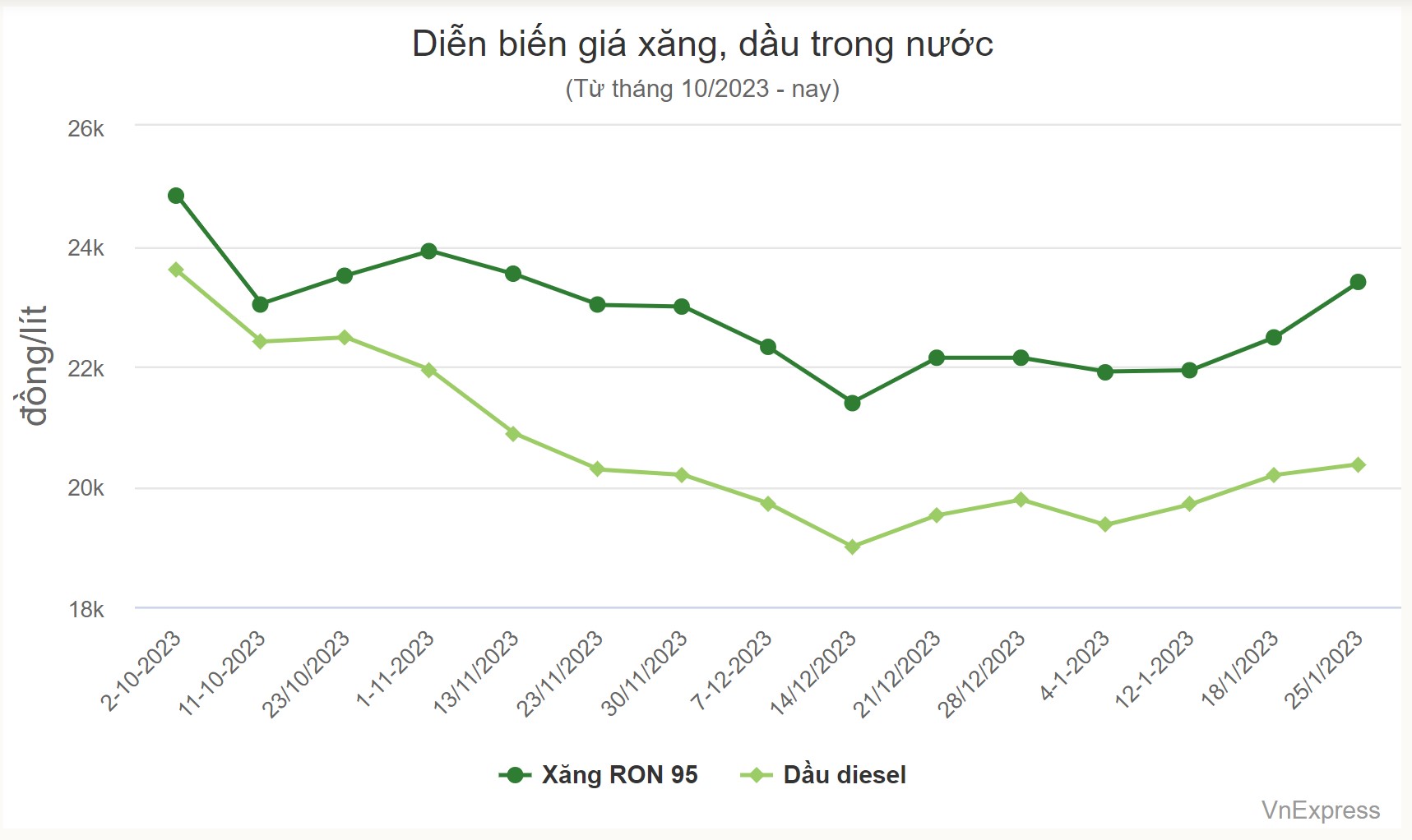 Trước đó, giá bán lẻ xăng dầu phổ biến trên thị trường (vùng 1) như sau: xăng RON 95-V 23.270 đồng/lít, xăng RON 95-III 22.480 đồng/lít, xăng E5 RON92 21.410 đồng/lít, dầu diesel 20.190 đồng/lít, dầu hỏa 20.530 đồng/lít và dầu mazut 15.500 đồng/kg.