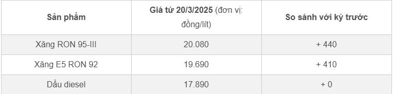 Tại kỳ điều hành gần đây nhất (ngày 20/3), giá xăng RON 95 tăng 440 đồng/lít, giá bán ra là 20.080 đồng/lít.