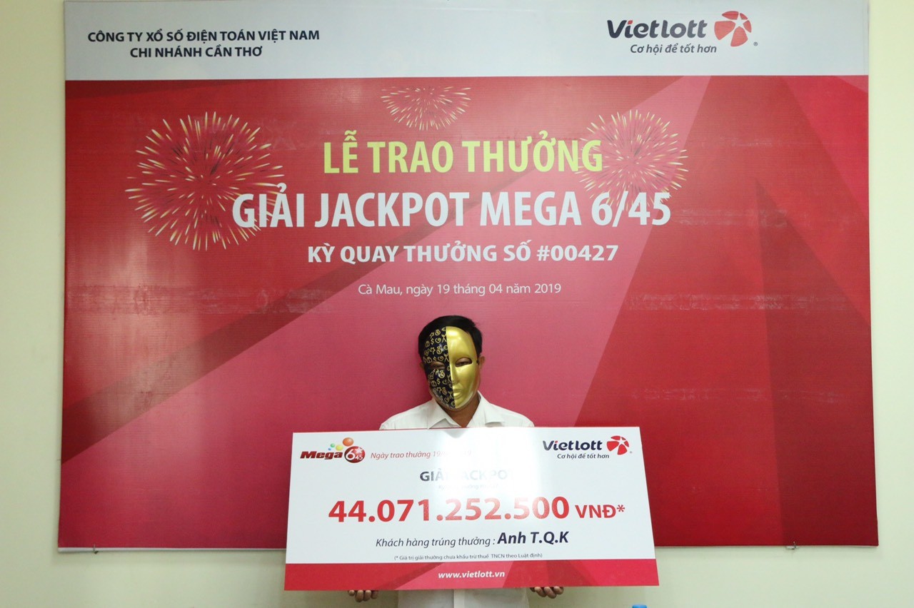 Ngày 19/4, đại diện công ty Xổ số điện toán Việt Nam (Vietlott) chi nhánh Cần Thơ đến tỉnh Cà Mau trao giải thưởng Jackpot sản phẩm Mega 6/45 kỳ thứ 427 cho khách hàng may mắn trúng thưởng.