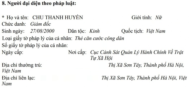 Theo Cổng thông tin quốc gia về đăng ký doanh nghiệp, Chu Thanh Huyền hiện là Giám đốc kiêm người đại diện pháp luật của một doanh nghiệp có trụ sở tại phường Dịch Vọng Hậu, quận Cầu Giấy, Hà Nội.