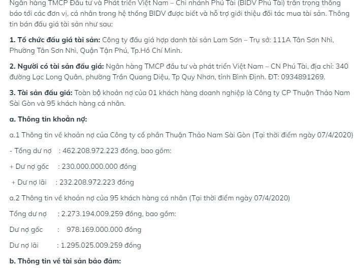 Theo thông báo của BIDV Phú Tài, khoản nợ của CTCP Thuận Thảo Nam Sài Gòn có tổng dư nợ hơn 462 tỷ đồng, gồm 230 tỷ đồng nợ gốc và 232 tỷ đồng dư nợ lãi. Gói nợ của 95 khách hàng cá nhân khác có tổng dư nợ hơn 2.273 tỷ đồng, gồm 978 tỷ đồng dư nợ gốc và 1.295 tỷ đồng dư nợ lãi.