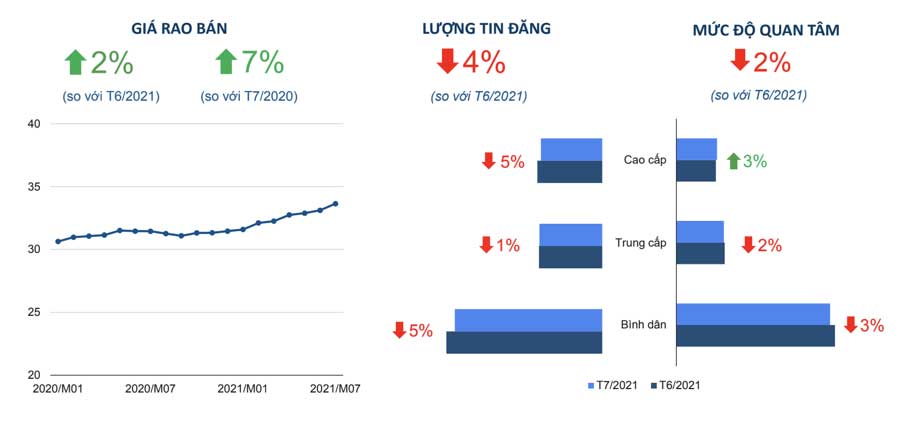 Cụ thể, trong tháng 7/2021 chứng kiến số ca Covid-19 đạt đỉnh, thị trường bất động sản Việt Nam tiếp tục chịu những tác động tiêu cực, đặc biệt ở các tỉnh miền Nam. Giao dịch nhiều nơi giảm 60-70%.