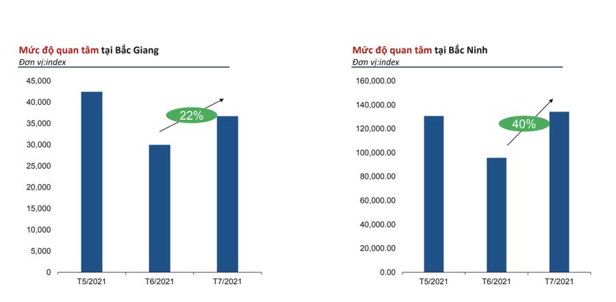 Trong khi đó, mức độ quan tâm tại Hải Phòng tăng 4%, Bắc Giang bật tăng trở lại 22%, Bắc Ninh là 44%.