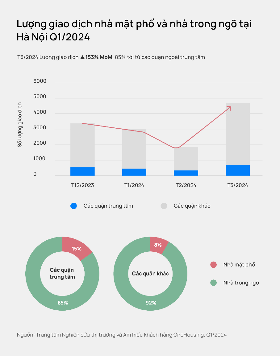 Trong tháng 3/2024, lượng giao dịch nhà trong ngõ tại các quận này tăng tận 176% so với tháng 2/2024. Trong đó, lượng giao dịch ở các quận ngoài trung tâm chiếm tới 85% tổng lượng giao dịch.