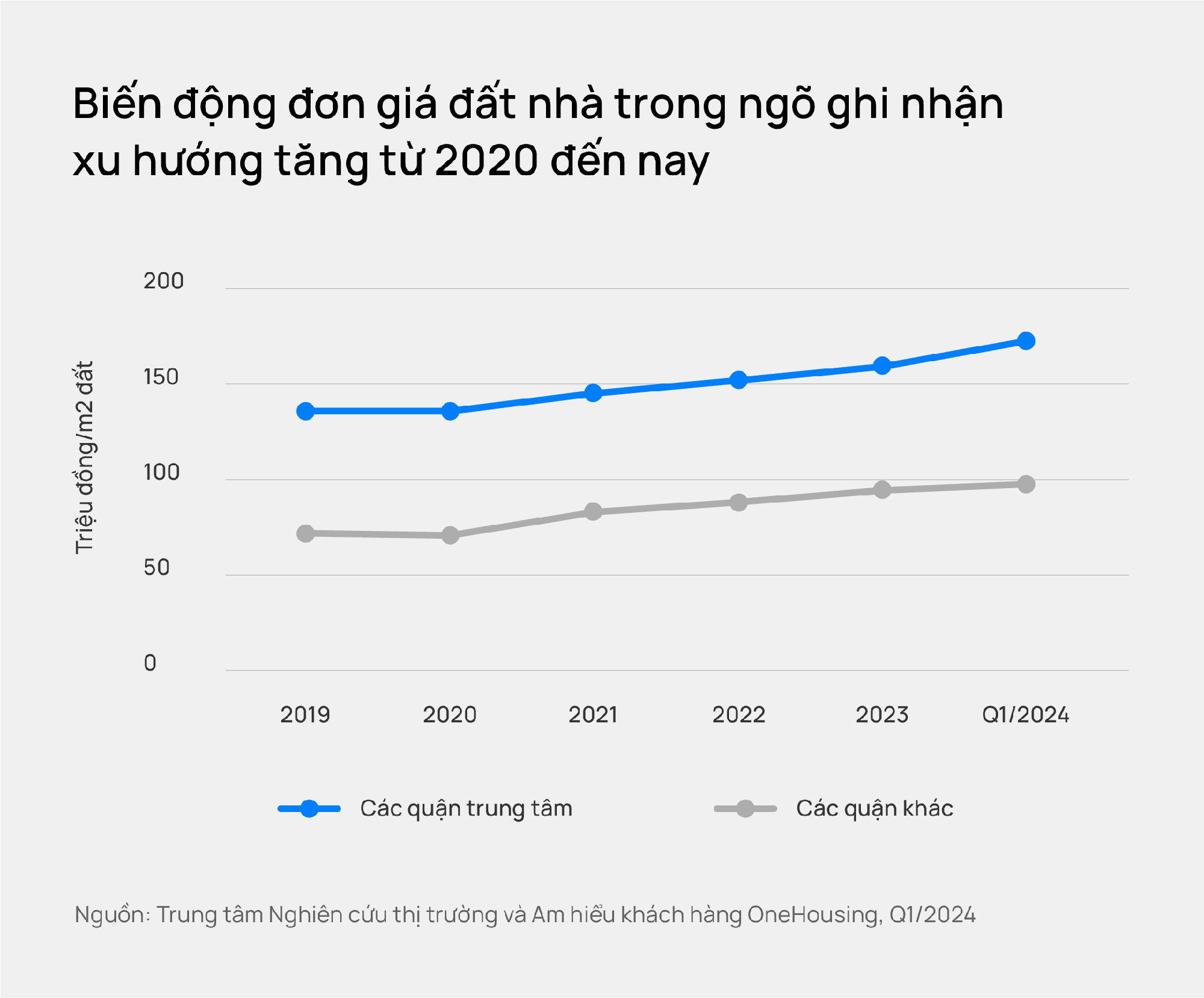 Hệ quả cho xu hướng này là đơn giá nhà đất trong ngõ ghi nhận xu hướng tăng trung bình 2,9% - 8,0% qua các năm từ 2020 tới nay. Trong quý I/2024, giá nhà trong ngõ đã đạt khoảng 170 triệu đồng/m2 đất đối với khu vực trung tâm và khoảng 100 triệu đồng/m2 đất đối với khu vực ngoài trung tâm.