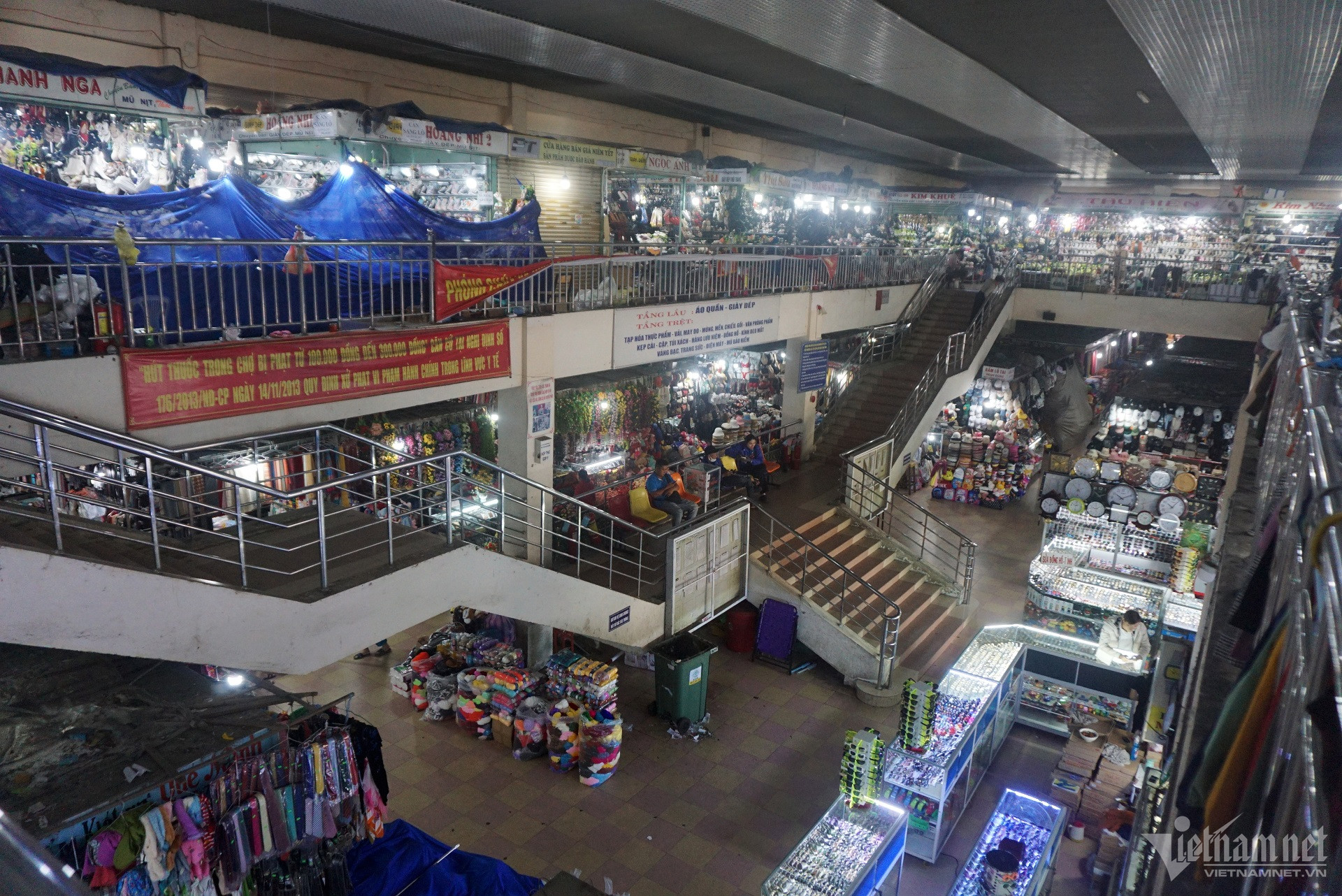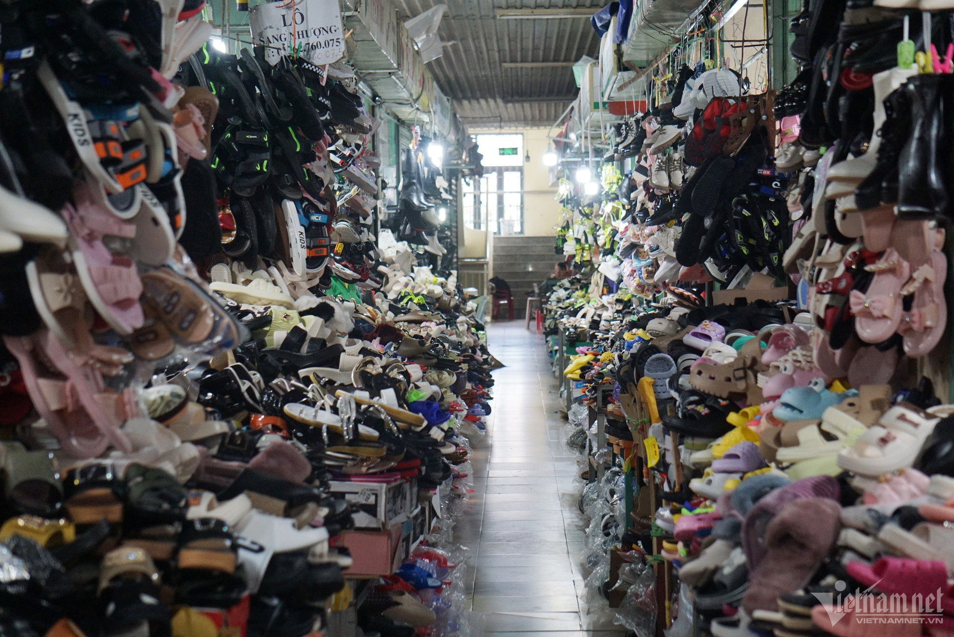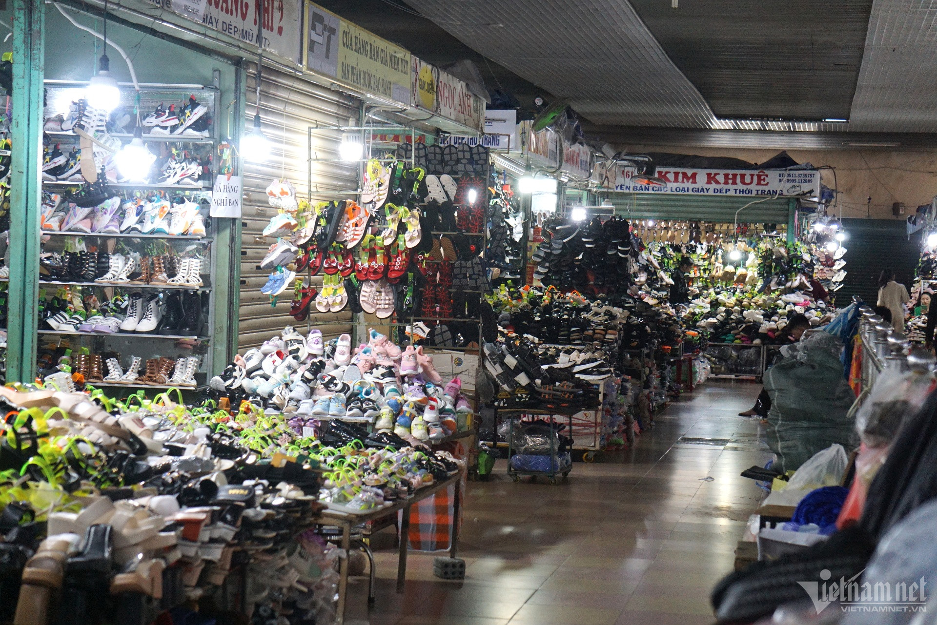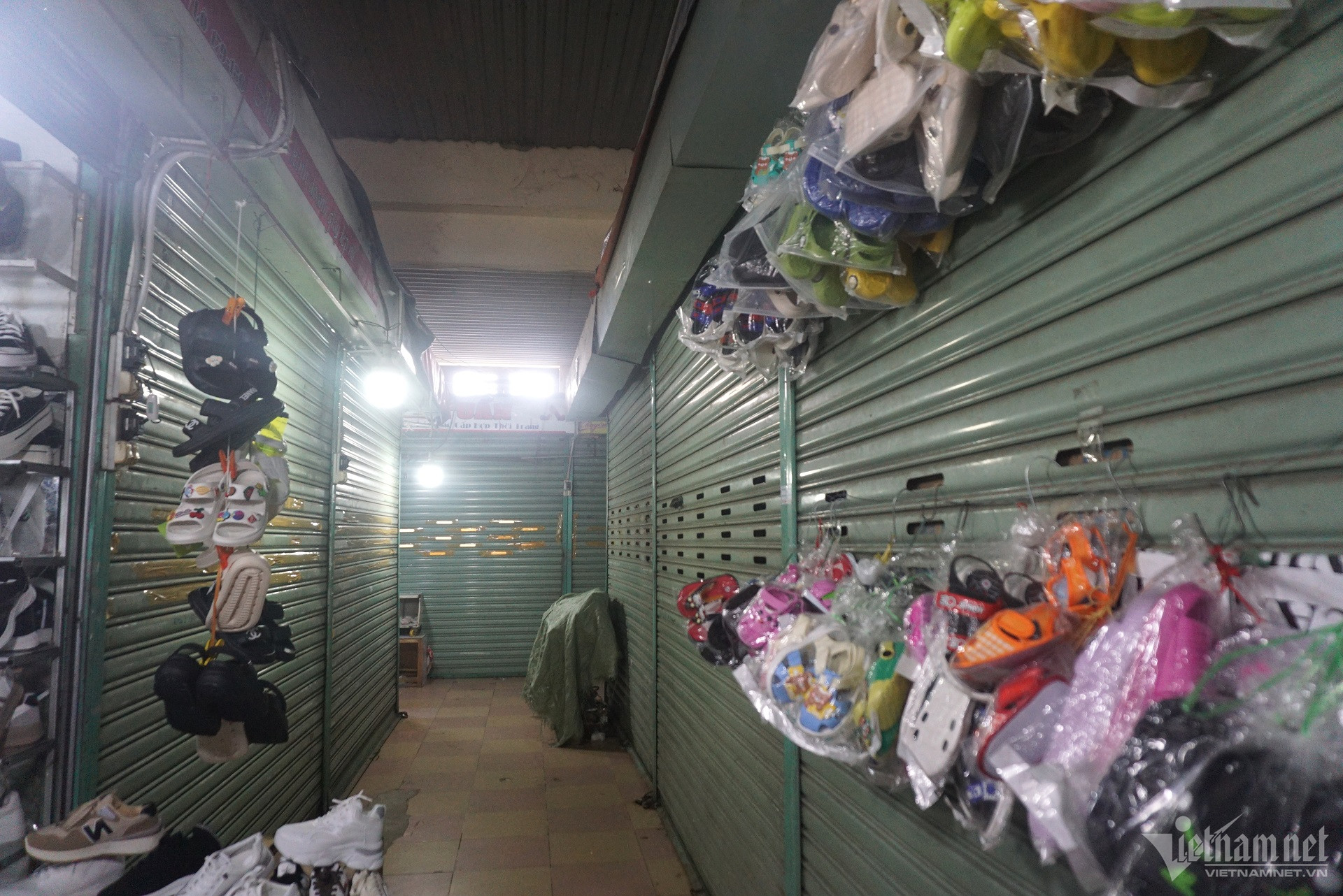 Tại chợ Hòa Khánh, các quầy, ki ốt bán giày dép, quần áo lác đác vài khách đi xem. Ế ẩm, tiểu thương ngồi lướt điện thoại, tám chuyện. Thậm chí, nhiều tiểu thương đành treo bảng sang lô, nghỉ bán.