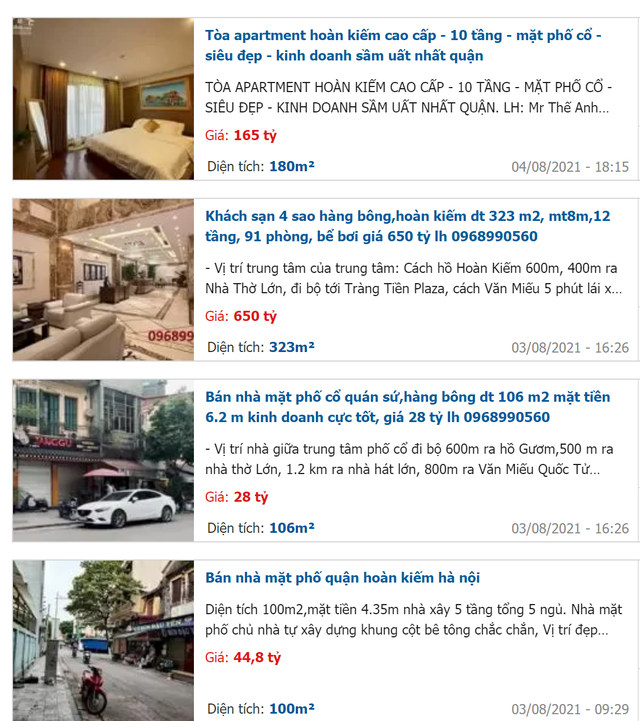 Khảo sát một vòng phố cổ và các trang tin, không khó bắt gặp hàng loạt những căn mặt phố đang được rao bán với giá hàng chục, hàng trăm tỷ đồng. Đơn cử như, một toà nhà 10 tầng xây trên diện tích 390m2 với mặt tiền 9,5m nằm trên phố Hàng Bông hiện được bán tới 650 tỷ đồng, tức là 1,6 tỷ đồng/m2. Tuy nhiên, mức giá đắt kỷ lục từ trước đến nay phải kể đến một Khách sạn 4 sao tại phố Hàng Bông đang được rao bán hơn 2 tỷ/m2 với giá 650 tỷ đồng cho diện tích 323 m2, mặt tiền 8m,12 tầng, 91 phòng.