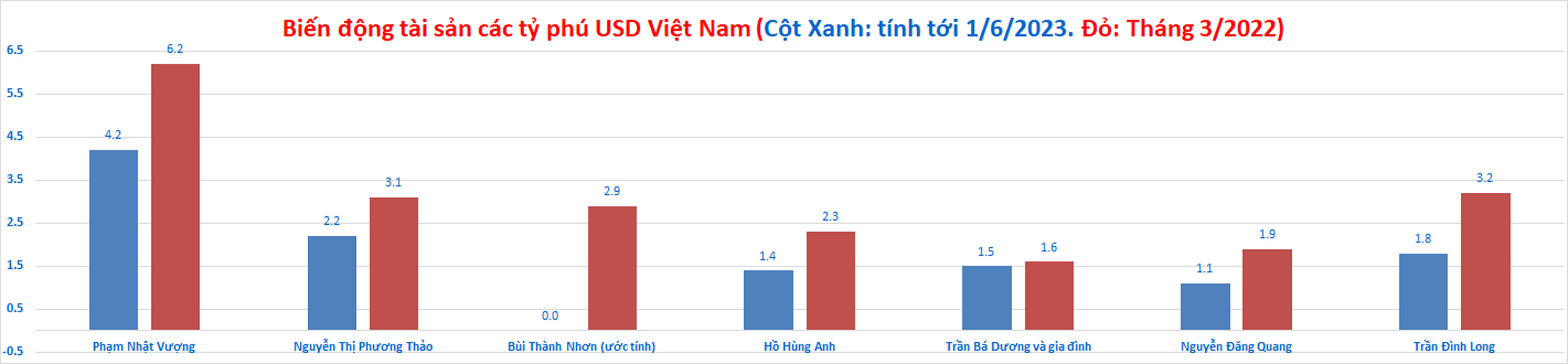 Trên sàn chứng khoán, trong danh sách tỷ phú USD thế giới năm 2023 (Tạp chí Forbes công bố đầu tháng 4), Việt Nam có 6 đại diện. Tổng giá trị tài sản đạt 12,6 tỷ USD, giảm 8,6 tỷ USD so với năm ngoái.
