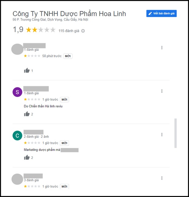 Dù vậy, nhưng dường như hàng động xoa dịu này của Dược phẩm Hoa Linh và chiến thần Hà Linh vẫn không được lòng dư luận. Đến sáng nay - 5/4, Dược phẩm Hoa Linh bất ngờ nhận hàng loạt đánh giá 1 sao trên Google cùng những lời nhận xét mang tính công kích.