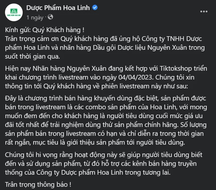 Đối diện với khủng hoảng phát sinh, mới đây phía công ty Dược phẩm Hoa Linh đã chính thức lên tiếng giải thích về nội dung chương trình livestream của mình. Theo bài đăng trên trang Facebook chính thức, Dược phẩm Hoa Linh cho biết những sản phẩm được bán với 11.000 - 18.000 có số lượng giới hạn và chương trình ưu đãi ''sốc'' này chỉ diễn ra trong thời gian rất ngắn với mục tiêu là giới thiệu sản phẩm tới người tiêu dùng.
