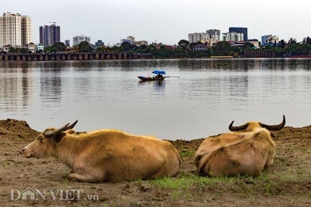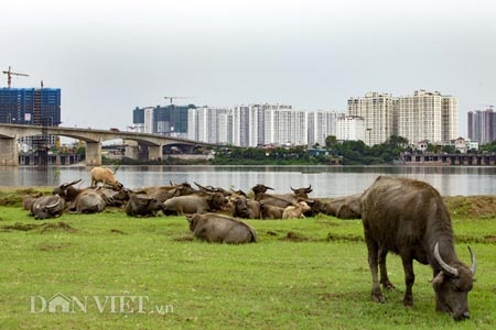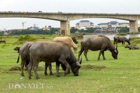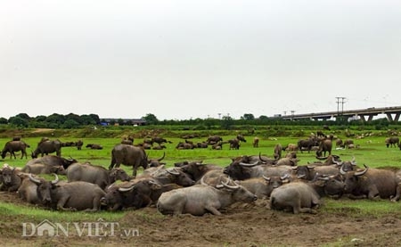 Ngay dưới chân cầu Vĩnh Tuy, thuộc khu vực bãi giữa Sông Hồng, quận Long Biên (Hà Nội) là nơi vợ chồng ông Nguyễn Văn Tiến chăn thả đàn trâu nái lên tới gần 200 con. |