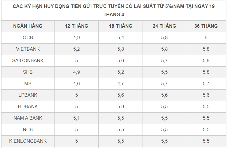 Ngay cả với kỳ hạn gửi tiết kiệm 12 tháng, hiện chỉ còn số ít ngân hàng duy trì lãi suất từ 5%/năm cho tiền gửi trực tuyến kỳ hạn này, bao gồm: VietBank (5,2%/năm), Nam A Bank (5,1%/năm), và một số ít ngân hàng đang niêm yết lãi suất 5%/năm gồm: HDBank, NCB, KienLong Bank, LPBank, Saigonbank.