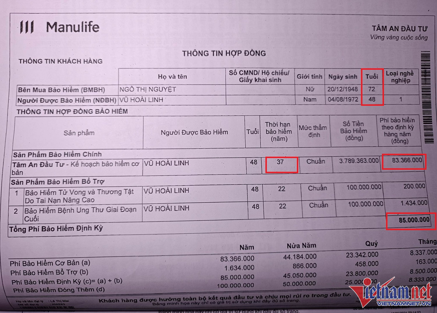 Theo hợp đồng, mỗi năm, bà Nguyệt sẽ phải đóng hơn 80 triệu đồng cho Manulife Việt Nam, cho đến hết năm thứ 37.