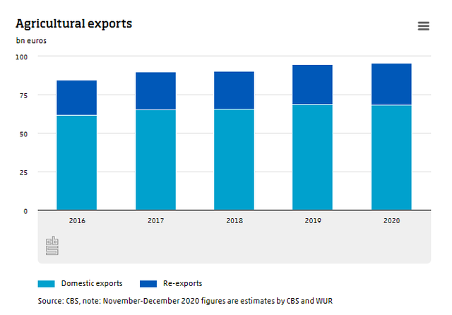 Số liệu của Tổng cục thống kê Hà Lan (CBS) và trung tâm nghiên cứu kinh tế Wageningen (WUR) cho thấy xuất khẩu nông nghiệp năm 2020 của Hà Lan đạt mức kỷ lục 95,6 tỷ Euro, cao hơn 1% so với năm 2019. Tổng thặng dư xuất khẩu nông sản của Hà Lan năm 2020 đạt tới 41,9 tỷ Euro. Nếu tính cả những sản phẩm liên quan đến nông nghiệp thì con số này là 105,4 tỷ Euro và thặng dư 46,1 tỷ Euro.