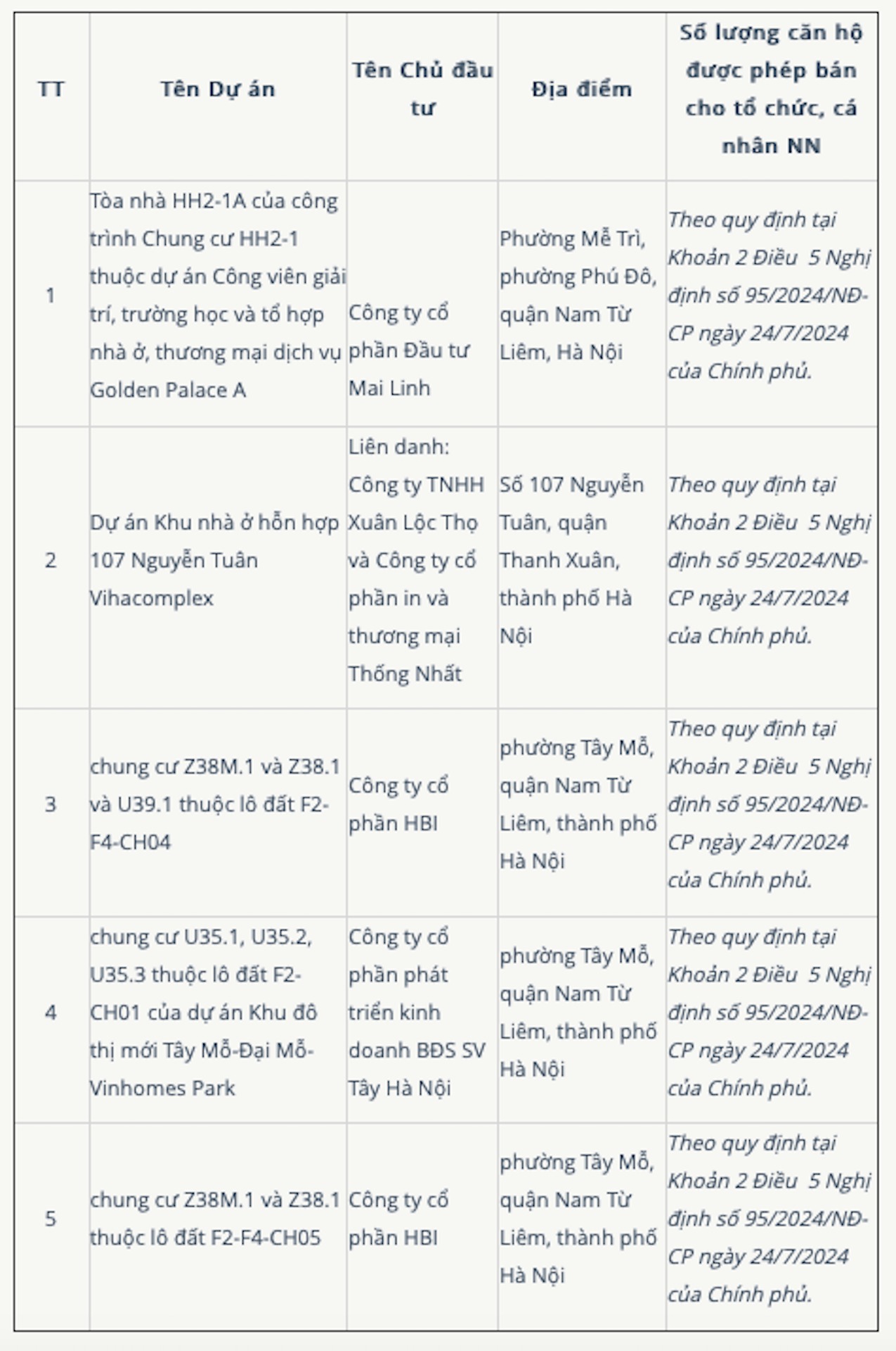 Ngoài ra, tòa HH2-1A thuộc dự án The Matrix One của CTCP Đầu tư Mai Linh cũng nằm trong danh sách vừa được Sở Xây dựng công bố được phép bán cho người nước ngoài.