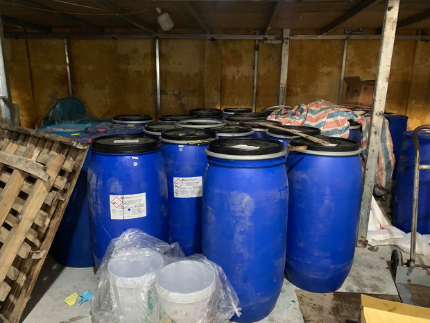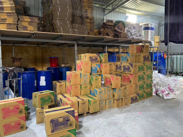 Cùng với đó là hàng trăm thùng hàng đã thành phẩm và nhiều can nhựa, nhãn mác, thùng carton dùng để đóng thành phẩm. Ngoài ra, lực lượng liên ngành cũng thu giữ rất nhiều nguyên vật liệu, hóa chất phục vụ cho quá trình sản xuất.