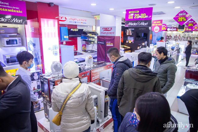 Ghi nhận tại cửa hàng Media Mart trên đường Nguyễn Chí Thanh, quận Ba Đình, Hà Nội, lượng khách hàng tập trung tới các gian hàng bày bán các sản phẩm sưởi ấm đông đúc, vượt trội so với các gian hàng khác.