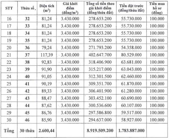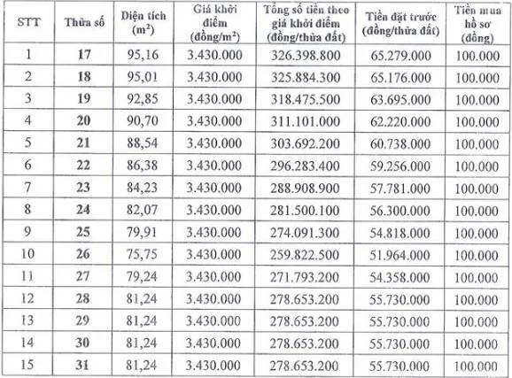Các thửa đất có diện tích dao động từ 75 - 117m2; giá khởi điểm 3.430.000 đồng/m2.