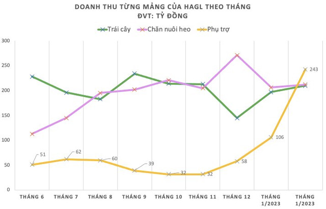 Đáng chú ý là ngành phụ trợ đóng góp đến 243 tỷ đồng, tăng trưởng đột biến khi gấp đôi tháng trước (tháng 1/2023) và gấp 5 lần mức trung bình 40 tỷ/tháng các tháng gần đây. Đây lại là mảng mang lại doanh thu cao nhất cho HAGL nhưng chưa được công bố chi tiết.