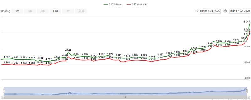 Không dừng ở đó, giá vàng SJC tiếp tục leo thang và vào cuối giờ sáng đã vượt ngưỡng 53 triệu đồng/lượng. Mức giá này được Công ty vàng bạc đá quý Sài Gòn giữ cho tới cuối giờ chiều phiên giao dịch 22/7. Cụ thể, giá vàng SJC được Công ty vàng bạc đá quý Sài Gòn chốt ngày ở mức 52,1 triệu đồng (mua vào) và 53,07 triệu đồng/lượng (bán ra).