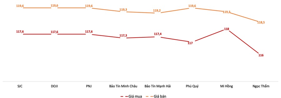 Trong phiên sáng 17/6/2025, giá mua, bán vàng miếng tại các đơn vị kinh doanh lớn ghi nhận 2 nhịp điều chỉnh tăng, giảm đan xen. Đóng cửa phiên sáng ngày 17/6, giá mua vào vàng miếng phổ biến được niêm yết tại 117,6 triệu và giá bán ra từ 119,3 triệu – 119,6 triệu đồng. Tuỳ từng thương hiệu, giá giao dịch vàng miếng vẫn không thay đổi hoặc ghi nhận mức giảm từ 200 nghìn đến 500 nghìn đồng mỗi chiều so với phiên hôm qua (16/6).